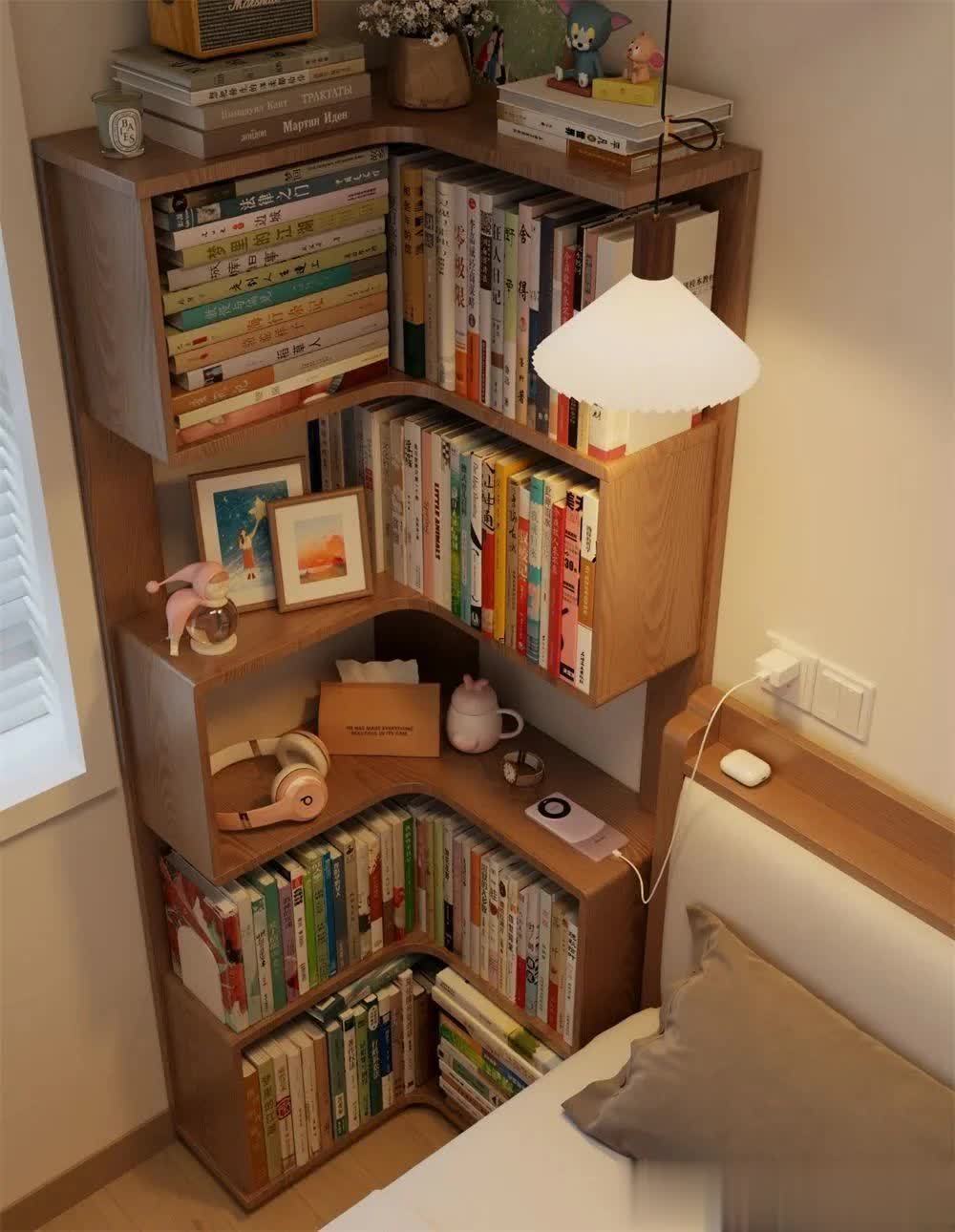 就比如放暑假,直接将床头的转角变成书柜,既是床头睡眠区,又是家里的阅读角,睡前随便抽出一本书看看,想想其实还是有些浪漫惬意感在里面的!