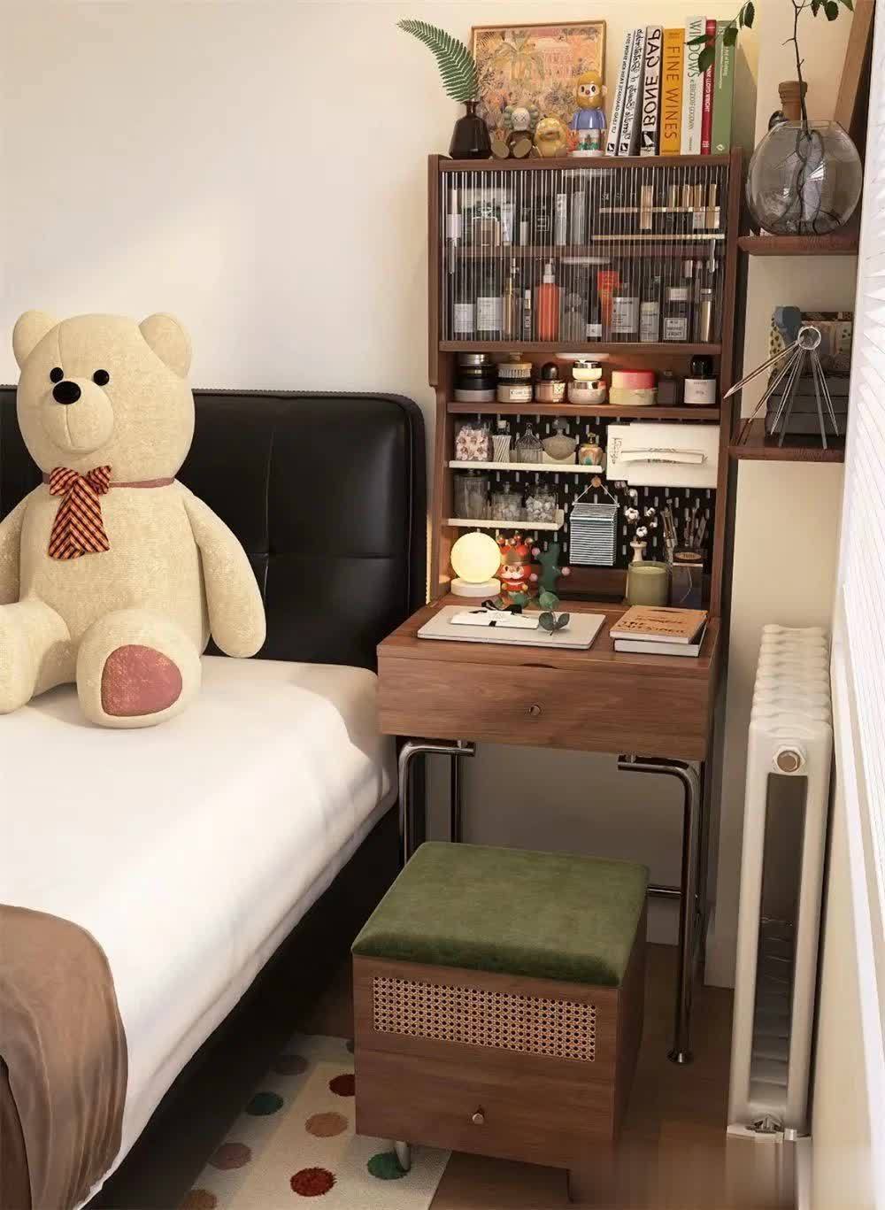 不少小卧室其实也压根没有放床头柜的空间,与其放床头柜,还不如直接将床头柜功能融入书桌或者梳妆台。